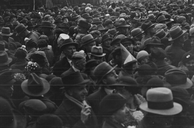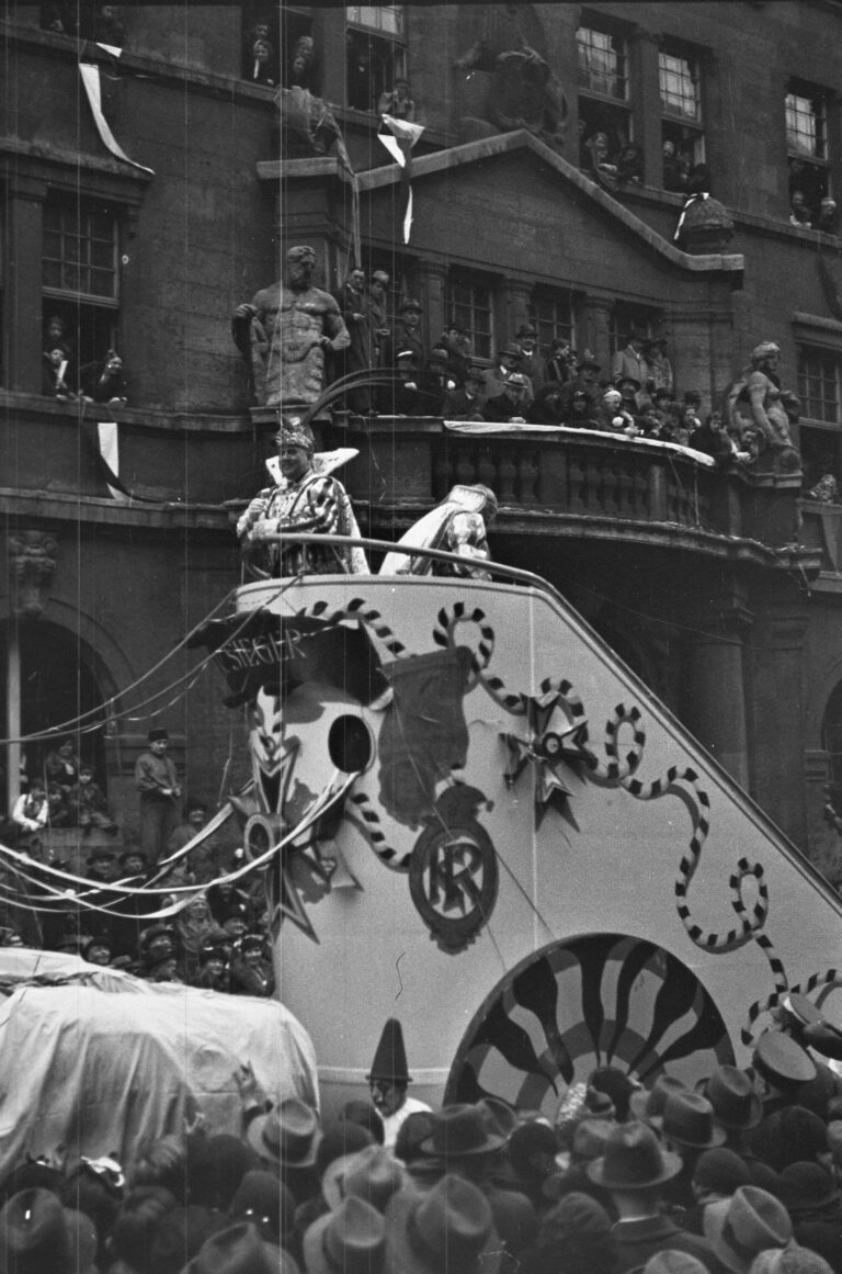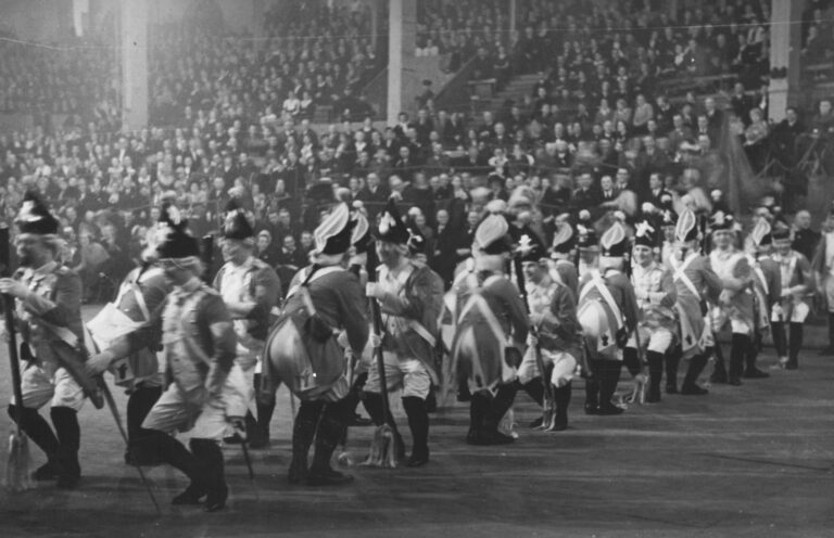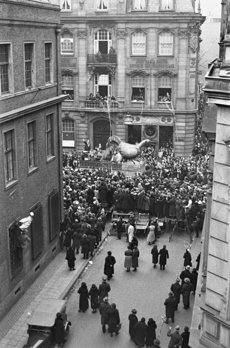 Der damit verbundene Aufschwung kam sowohl den »Roten Funken« als auch den NS-Behörden zugute, die das Fest propagandistisch nutzten – wie hier auf dem Bild im Hintergrund bei einem Auftritt der »Funken« bei einer Großveranstaltung der NS-Organisation »Kraft durch Freude« 1935.