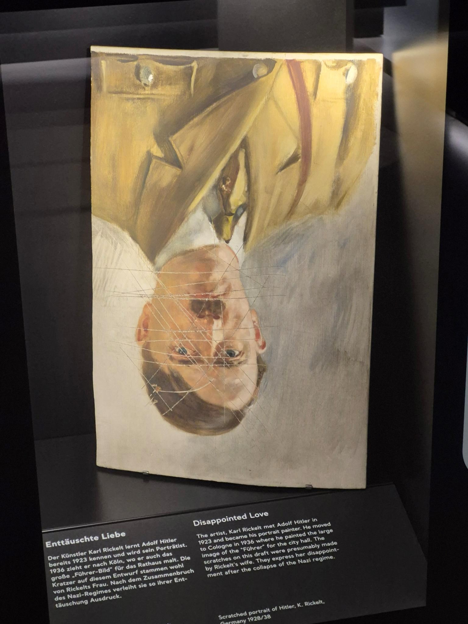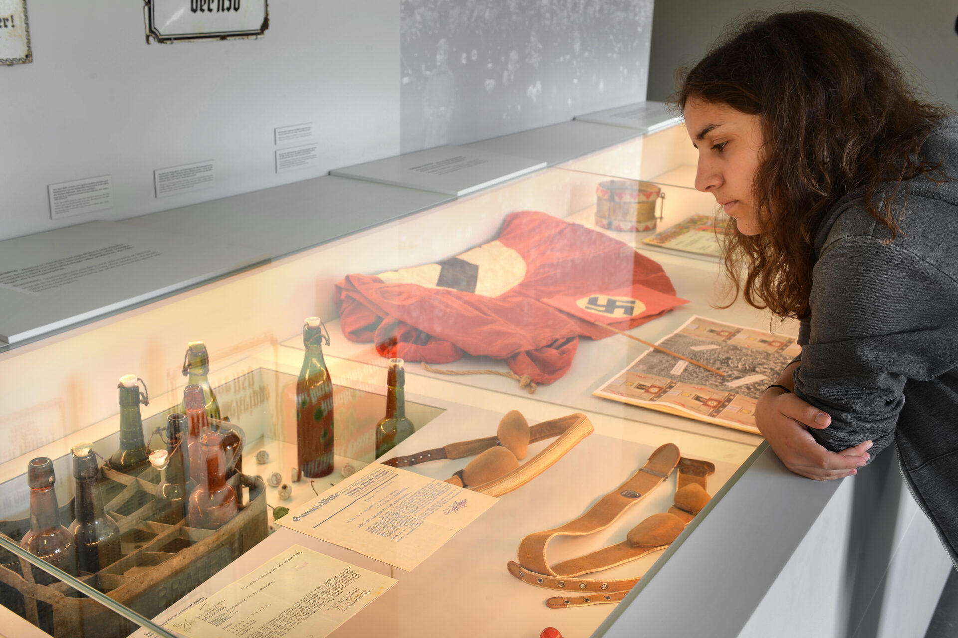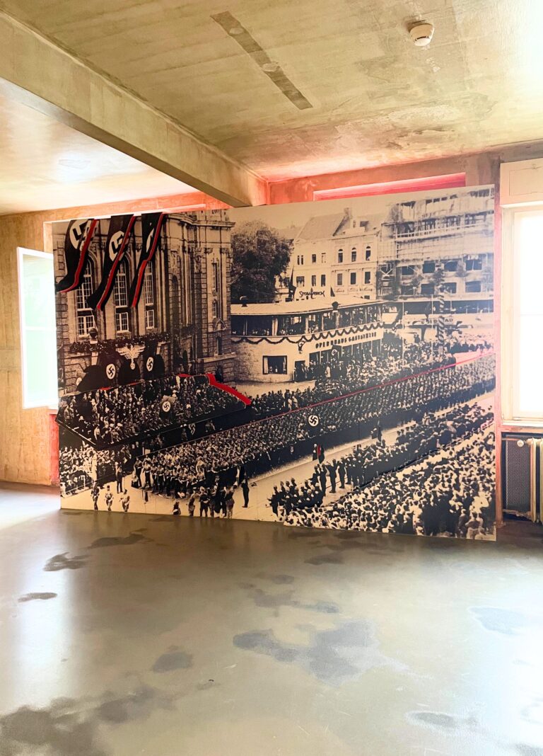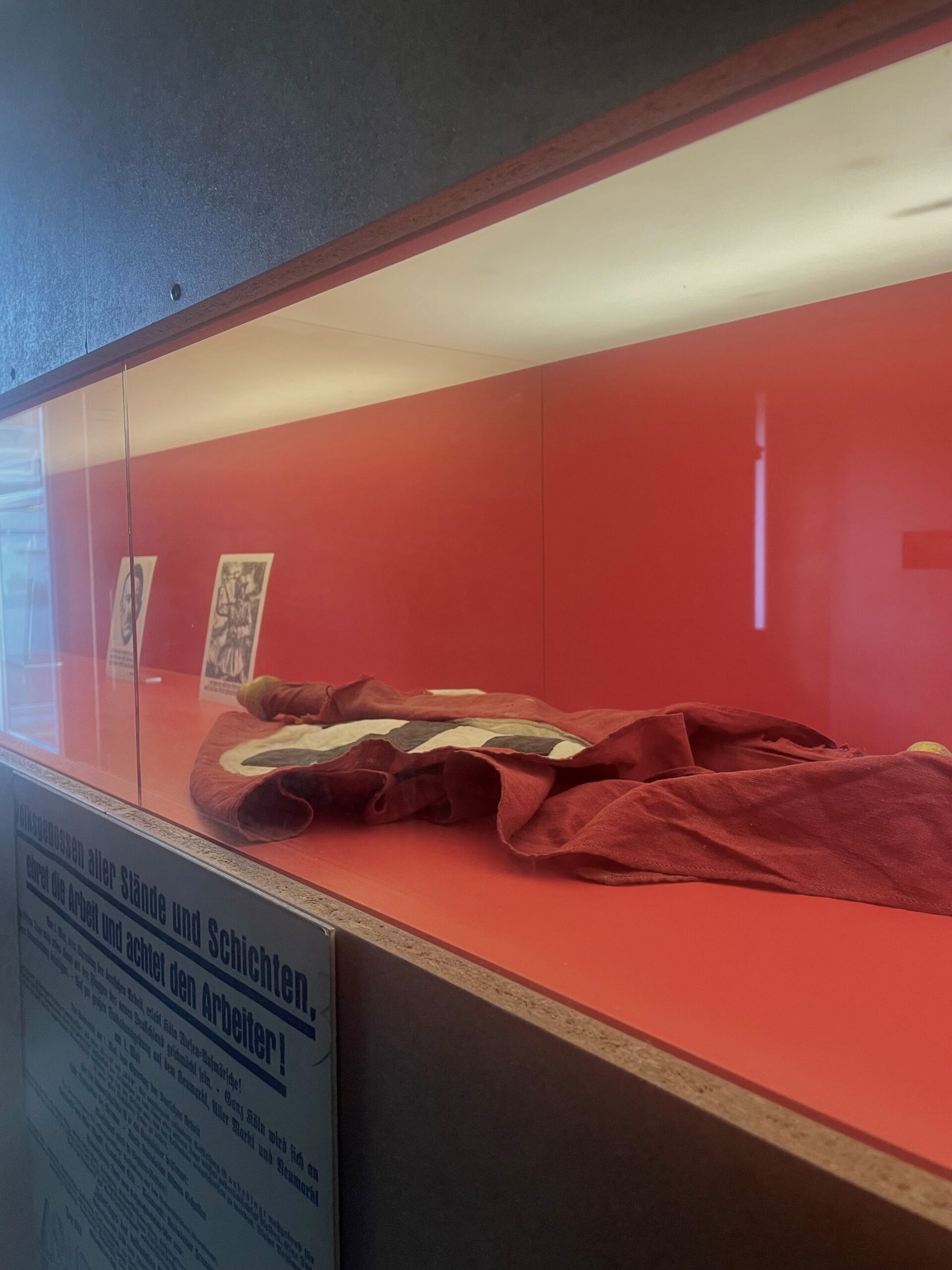 Setze den Gang durch die Ausstellung im 2. Stock fort. Dort geht es direkt weiter mit einer problematischen Hakenkreuz-Abbildung.