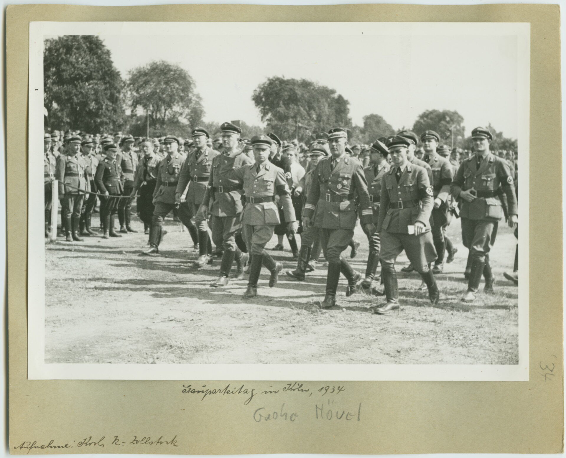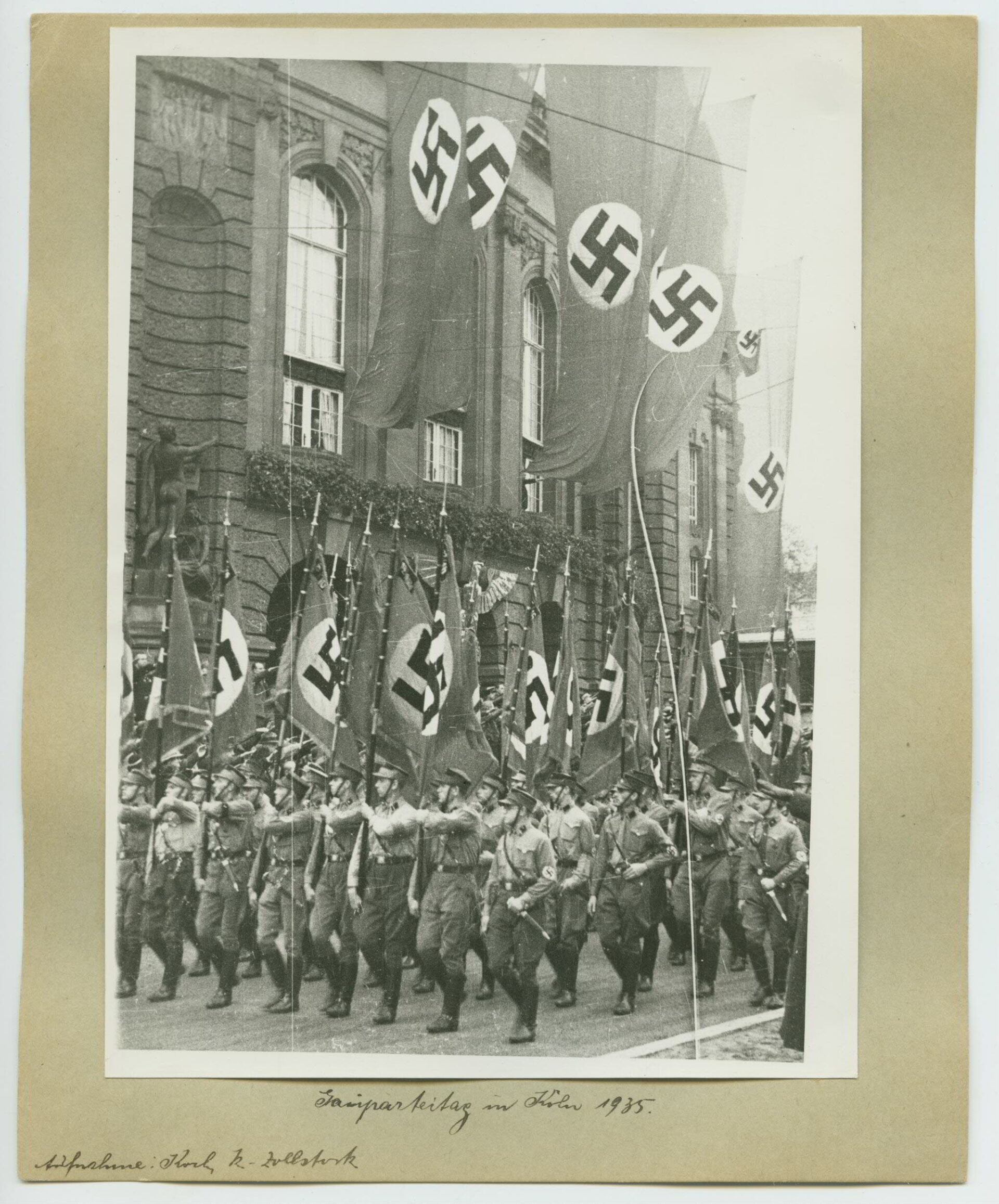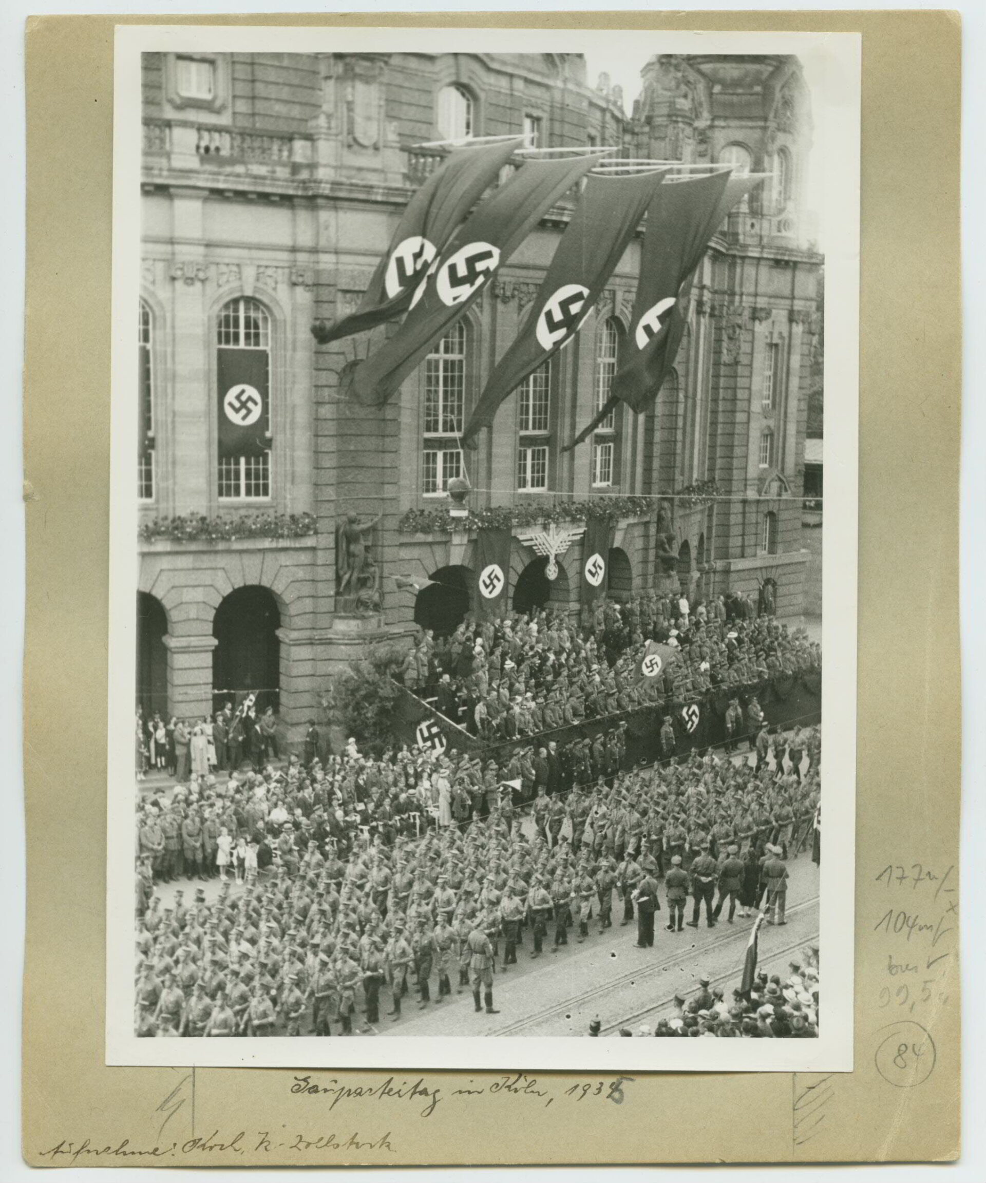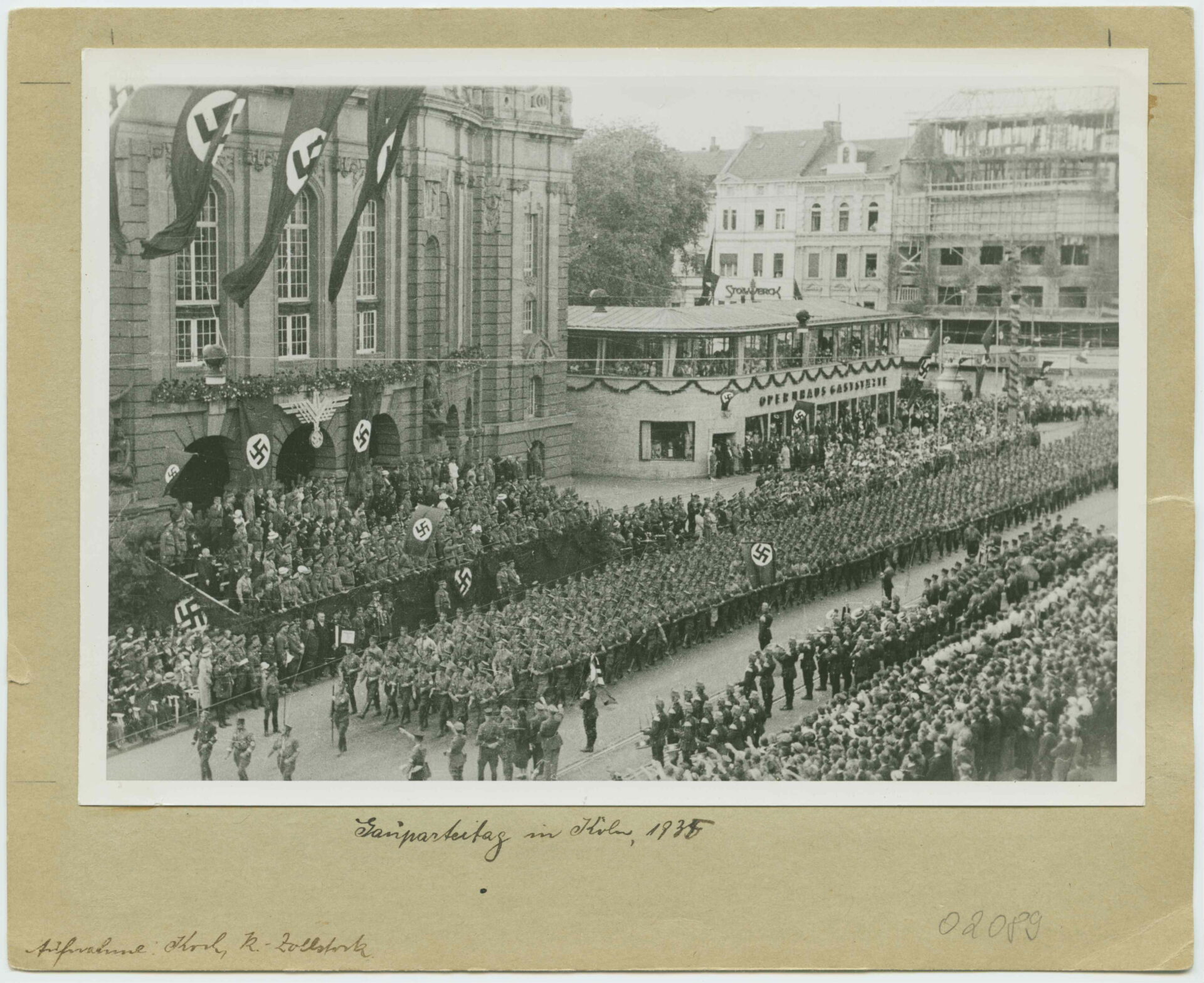 Es zeigt eine Parade vor dem Opernhaus am heutigen Rudolfplatz in der Kölner Innenstadt. Dieser Aufmarsch bildete den Abschluss des Kreisparteitages der NSDAP im Sommer 1935. Die Aufnahme hat Helmut Koch angefertigt, der in den 1930er Jahren als Bildjournalist für bekannte Kölner Zeitschriften tätig war.