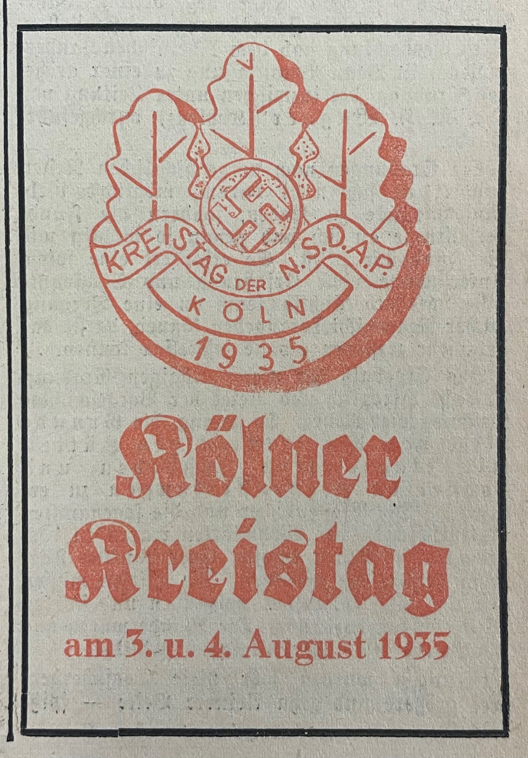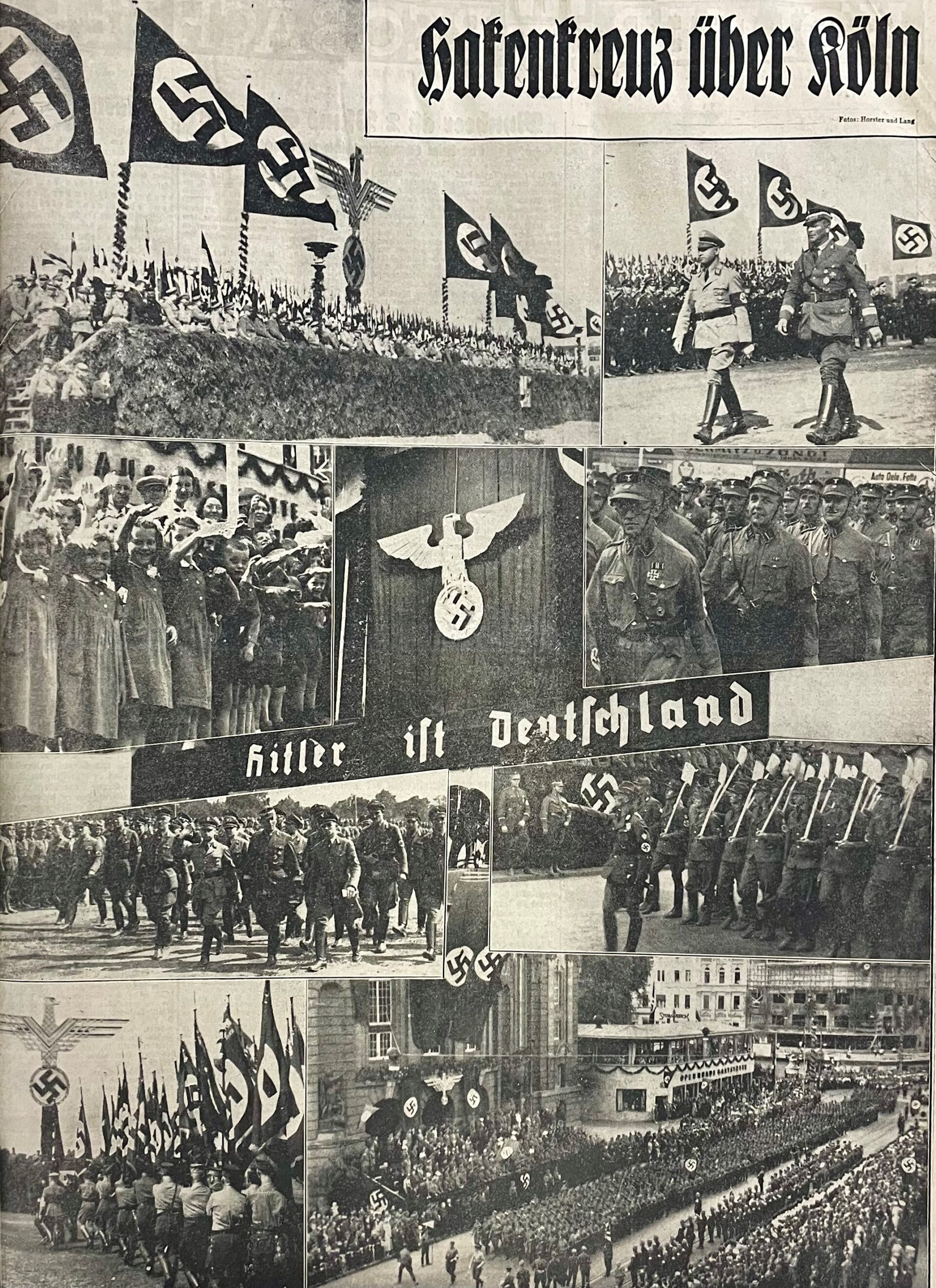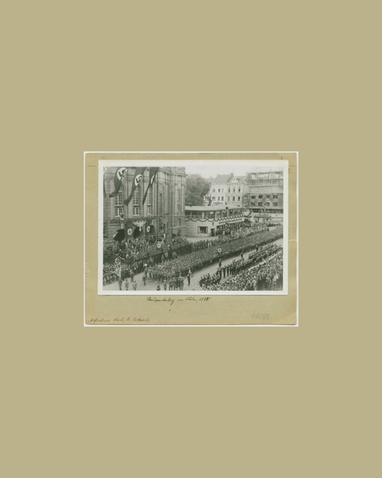 1: Raumansicht © privat; 2. Parade vor der Oper anlässlich des NSDAP-Kreistags in Köln am 4. August 1935 © NS-DOK; 3. Aufmarsch der SA in Nürnberg, 1934 © Bundesarchiv, Bild 183-K0326-0503-003 / CC-BY-SA 3.0; 4. Aufmarsch Kreis V Berlin 1936 © Bundesarchiv, Bild 183-2004-0812-500 / CC-BY-SA 3.0; 5. Reichsparteitag 1934 © Bundesarchiv, Bild 183-2004-0312-504 / CC-BY-SA 3.0; 6. Totenehrung beim Reichsparteitag 1934 © Bundesarchiv, Bild 102-04062A / Georg Pahl / CC-BY-SA 3.0; 7. Kundgebung im Berliner Lustgarten 1936 © Bundesarchiv, B 145 Bild-P022058 / CC-BY-SA 3.0; 8.-10. Parade vor der Oper anlässlich des NSDAP-Kreistags in Köln am 4. August 1935 © NS-DOK; 11. Ausstellungsansicht NS-DOK © Rheinisches Bildarchiv, rba_d003249; 12. Kreistag der NSDAP am 4. August 1935 © NS-DOK Bp 7143; 13. Abzeichen Kreistag 1935 in Köln © privat; 14. Westdeutscher Beobachter, 02.08.1935; 15. Westdeutscher Beobachter, 04.08.1935; 16. Parade vor der Oper anlässlich des NSDAP-Kreistags in Köln, 04.08.1935 © NS-DOK; 17. Altes Opernhaus am Rudolfplatz 1934 © NS-DOK; 18. Ausstellungsansicht Dokumentation Obersalzberg © Dokumentation Obersalzberg / Kradisch; 19. Ausstellungsansicht NS-DOK © privat; 20. Ausstellungsansicht Kölnisches Stadtmuseum © privat; 21. Ausstellungsansicht in der KZ-Gedenkstätte Buchenwald © Claus Bach, Sammlung Gedenkstätte Buchenwald; 22. Ausstellungsansicht im Kreismuseum Wewelsburg © Kreismuseum Wewelsburg / Fotografin: Lina Los; 23. Ausstellungsansicht im Dokumentationszentrum Reichsparteitagsgelände © Stefan Meyer / Dokumentationszentrum Reichsparteitagegelände