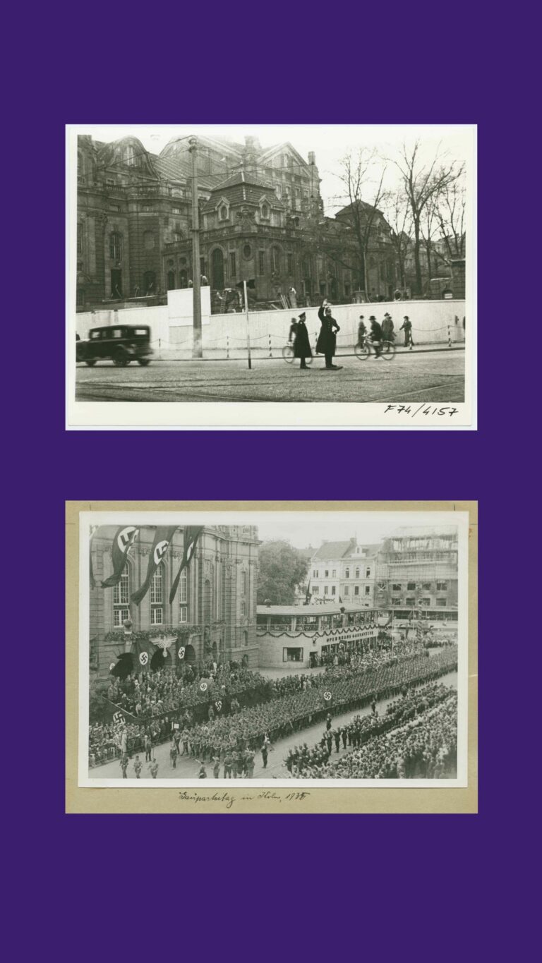 Hier siehst Du das gleiche Foto zusammen mit einer weiteren Aufnahme, die den Veranstaltungsort vor dem Opernhaus an einem gewöhnlichen Tag im Nationalsozialismus zeigt.