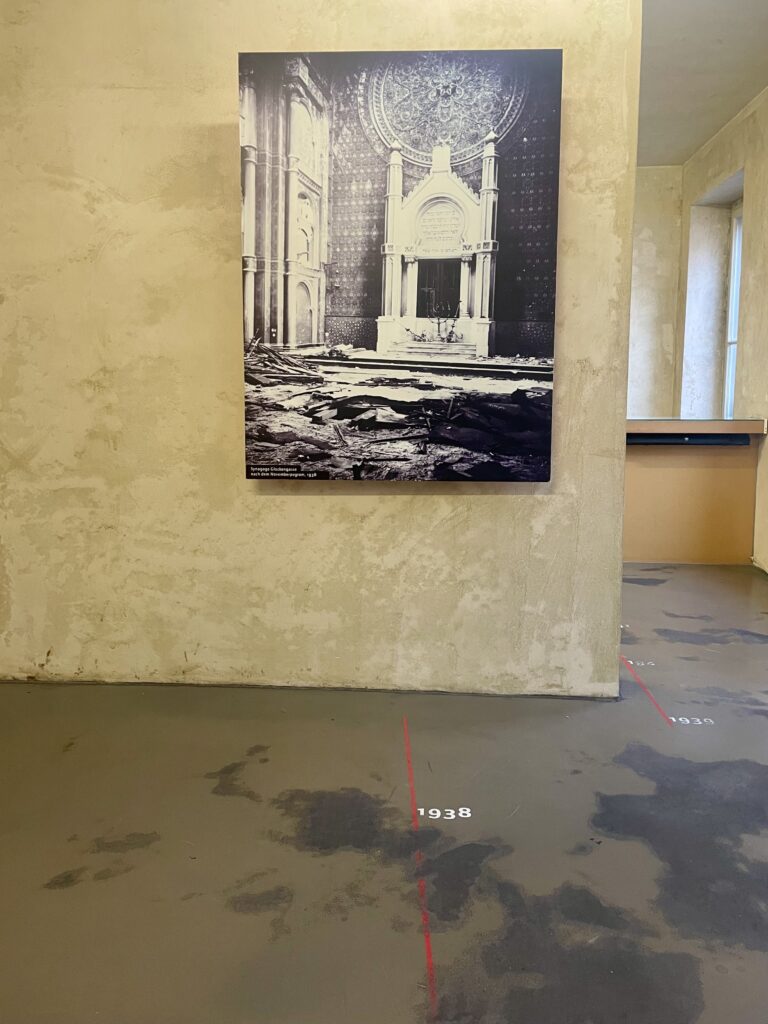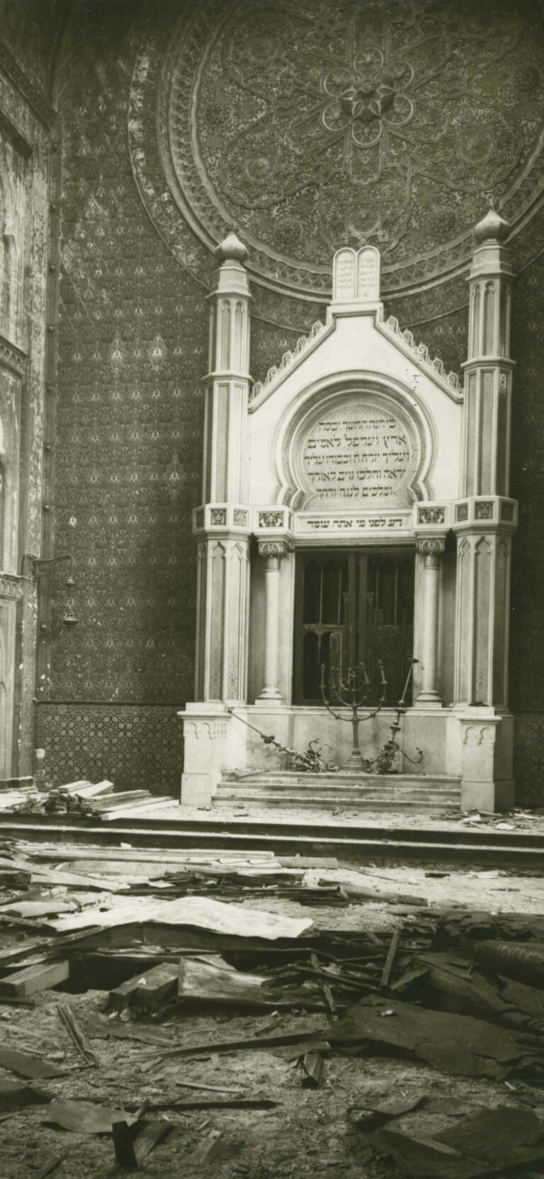 In den Tagen um den 9. November 1938 wurden reichsweit jüdische Gotteshäuser, Friedhöfe, Geschäfte und Wohnungen zerstört, mehrere hundert Jüdinnen und Juden ermordet. Während und nach diesen Novemberpogromen war es die Gestapo, die die Ausschreitungen beaufsichtigte, Hunderte jüdische Kölner in das KZ Dachau verschleppte und den Besitz der jüdischen Gemeinden beschlagnahmte, wie hier in der Synagoge in der Glockengasse.