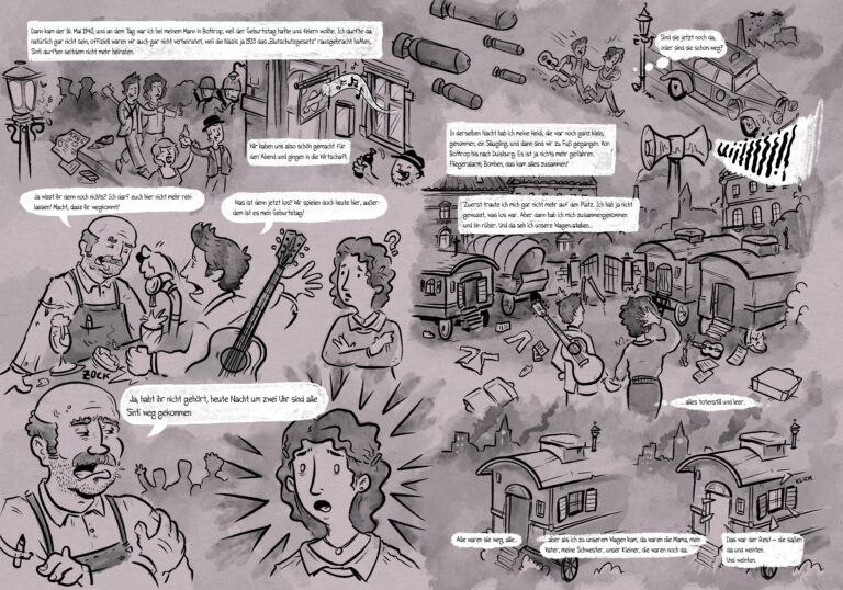 In its catalogue for an exhibition on the Nazi persecution of Sinti and Roma, the Kultur- und Stadthistorische Museum Duisburg published a graphic novel about the biography of the Sinta woman Hildegard Lagrenne. The narrative complements the official sources in the exhibition with a personal perspective.