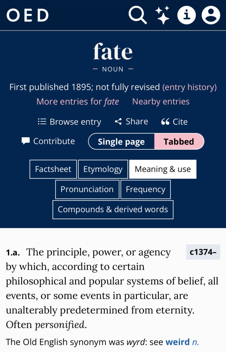fate: ‘The principle, power, or agency by which, according to certain philosophical and popular systems of belief, all events, or some events in particular, are unalterably